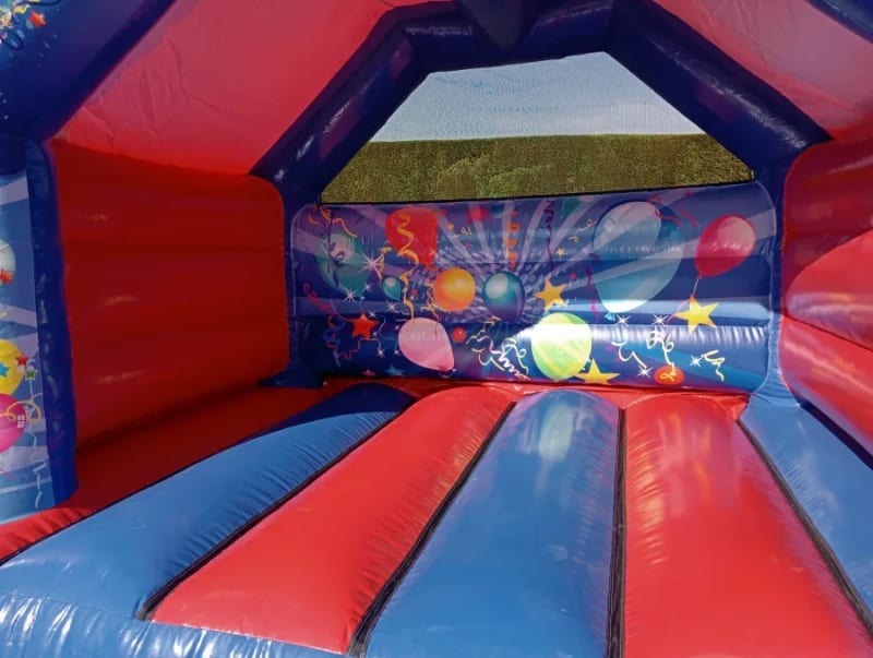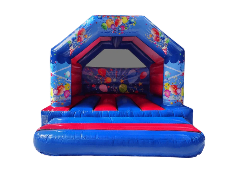 Coloured blue and red with multi coloured ballons